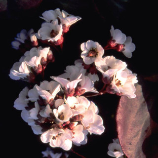Mi-hâtif. Bonne végétation. Feuillage vert. Fleurs blanches, rose pâle en fin de floraison.