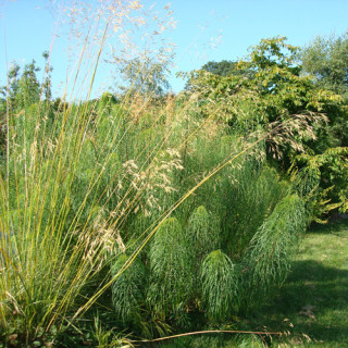Quick View Liste de souhait Ajouter au panier STIPA gigantea Touffes vigoureuses de feuillage vert intense luisant. Hampes très hautes, dressées. Épis aériens évoquant une folle avoine dorée, spectaculaire de la fin du printemps au début de l'hiver. 5,60 € Prix 180cm