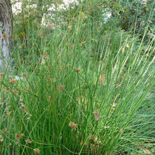 Grande espèce rhizomateuse, commune dans les marais et en bordure d'eau. Feuillage fin vert, épis bruns. Utilisation en sol frais à humide.