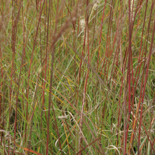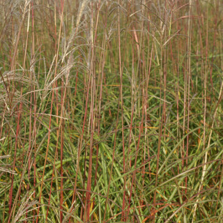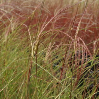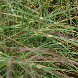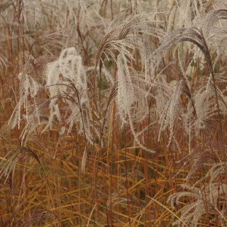 Feuillage fin, vert, se parant de zébrures dorées à partir de la fin du printemps. Le feuillage prend de très belles teintes rouges, brunes et orangées dès le début de l'automne. Floraison précoce en épis argentés devenant beiges.