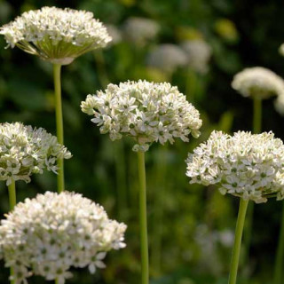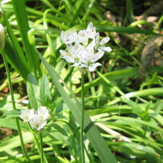 Floraison en petites ombelles blanc pur. Bulbe comestible à saveur aillée.