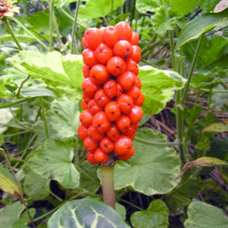 Vivace tubéreuse, formant de décembre à mai, des feuilles vertes veinées de blanc, sagittées à lancéolées de 35 cm. En juin apparaissent les fleurs de 15 à 40 cm, laissant place à des épis de baies rouge-orangé. Feuilles plus grandes à l'ombre qu'au soleil, mais floraison plus marquée au soleil.