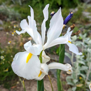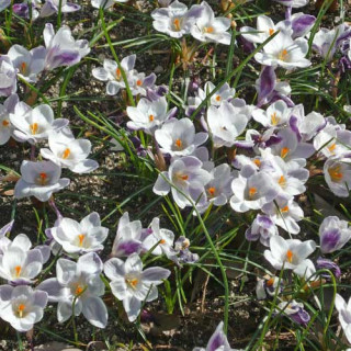 Jolie floraison blanche finement striée de violet. Plantation automnale dans un sol à tendance drainante.
