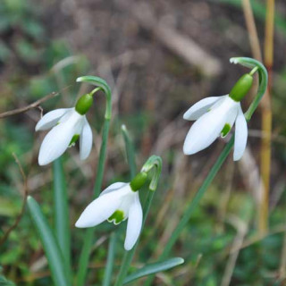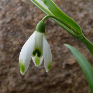 Feuillage glauque plus grand que celui du Galanthus nivalis et fleurs blanches portant 2 marques vertes sur les tépales internes.