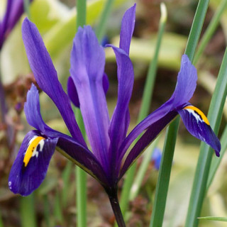 Les feuilles de cet Iris sont de section carrée mesurent 1 à 10cm de long. Courant février-mars apparaît une fleur solitaire de 6 à 8cm de diamètre, parfumée, de couleur bleu-violet avec une trace saillante jaune.