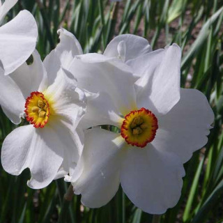 Fleurs très parfumées, de 5 à 8 cm de diamètre, en avril et en mai. Périanthe étalé, blanc pur entourant un coeur jaune décoré d'un liseré rouge.