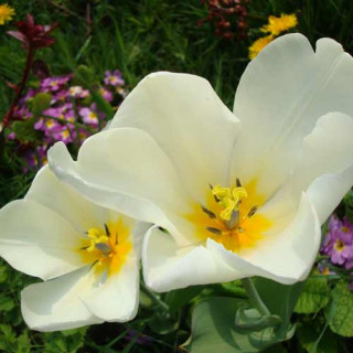 Très florifère. Tulipe formant de 3 à 6 feuilles vert-gris. En mars-avril se forment des fleurs de 15 à 20cm de diamètre, solitaires, blanc crème.