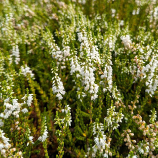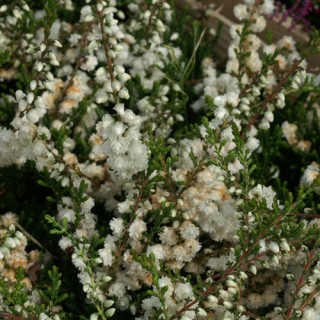 Bruyère persistante formant un coussin compact, au feuillage vert brillant et à la floraison hivernale abondante en clochettes blanches contrastées par des anthères sombres.