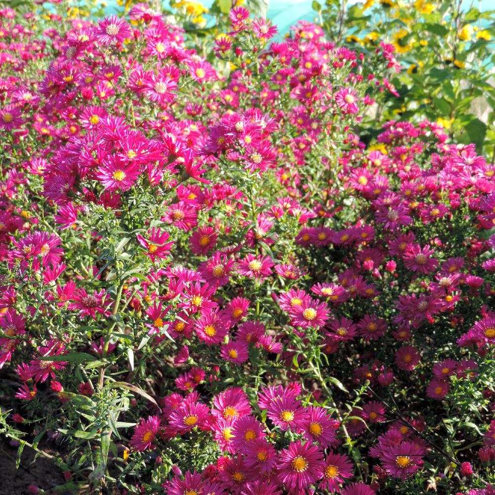 De la touffe buissonnante de l'ASTER nb 'Crimson Brocade jaillissent des fleurs rose foncé au disque central jaune d'or.