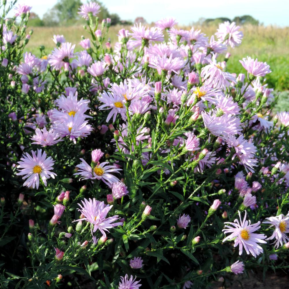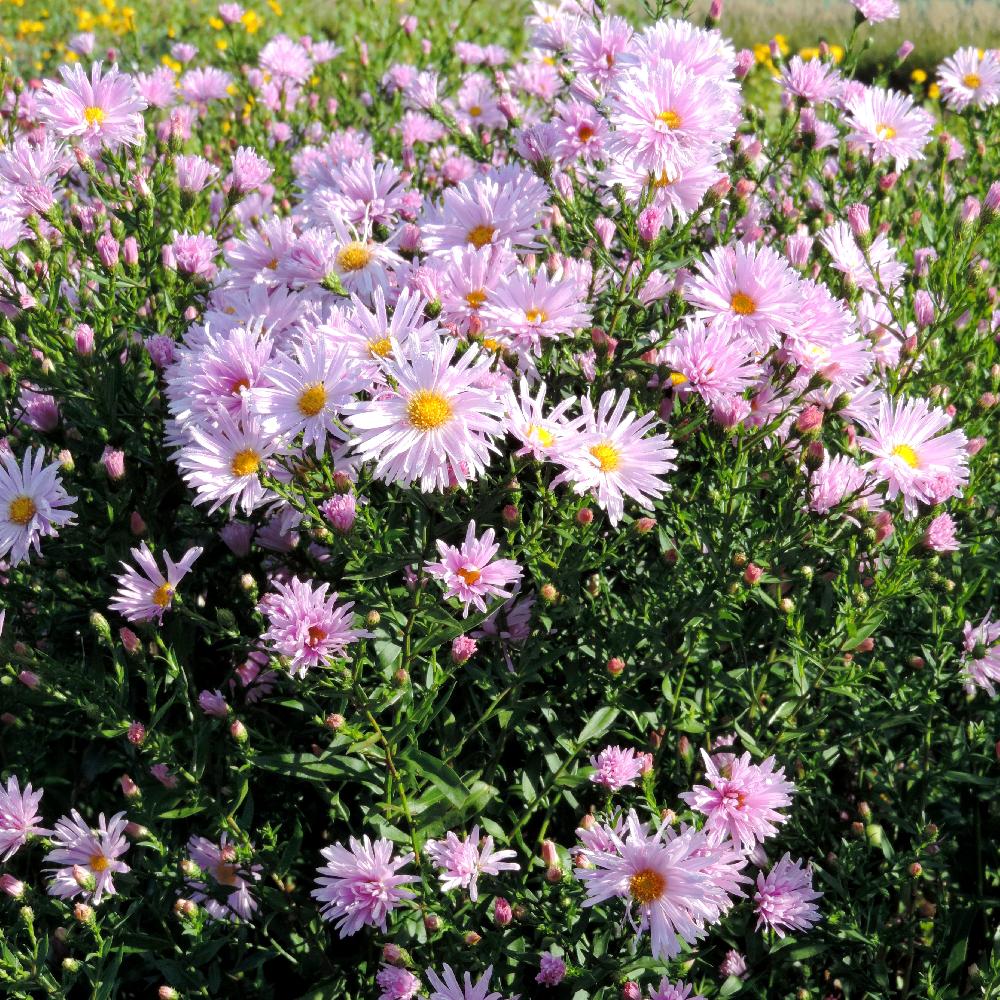 La floraison de L'ASTER nb 'Fellowship' est tardive. Les fleurs sont grandes, demi-doubles, rose clair, certainement l'un des meilleurs roses.