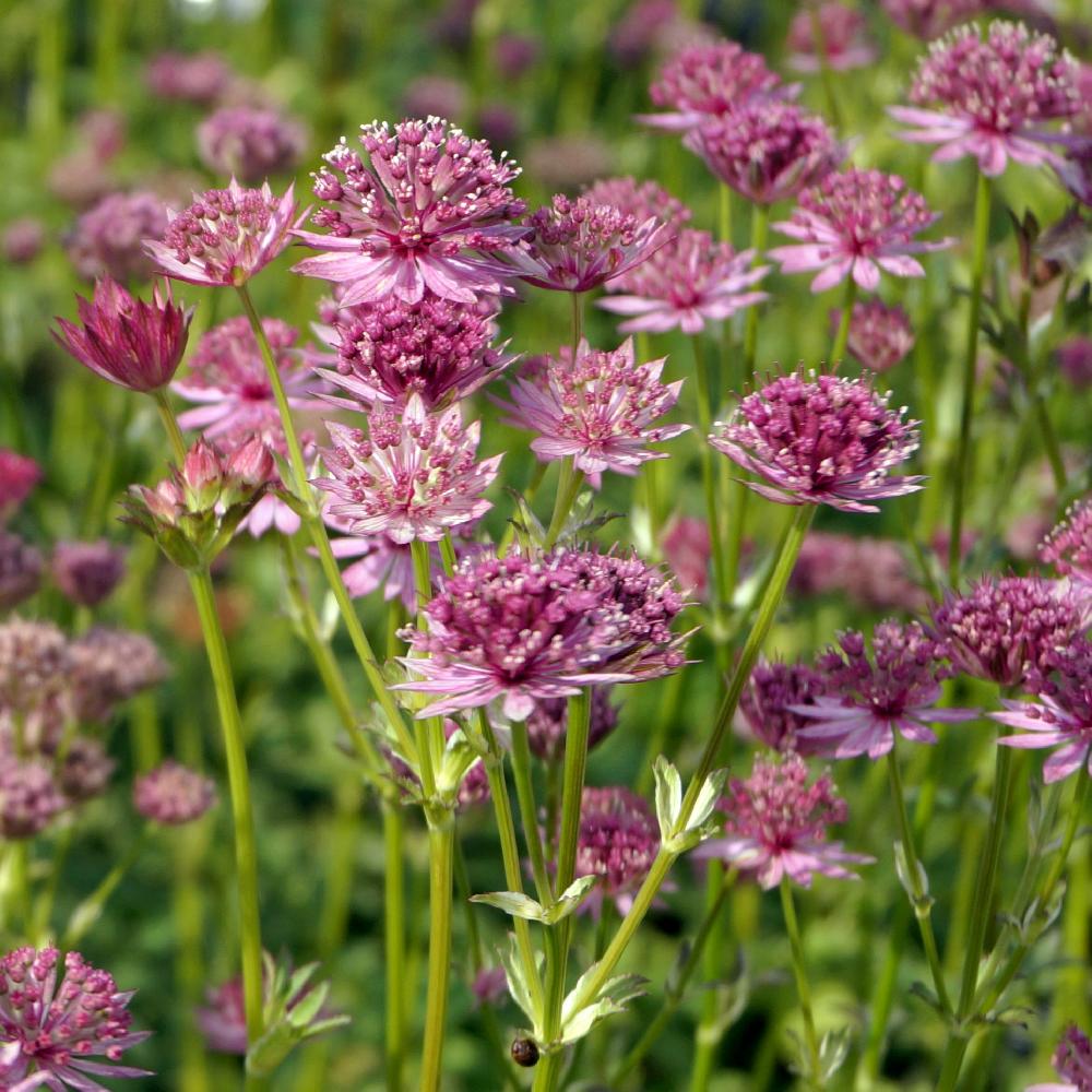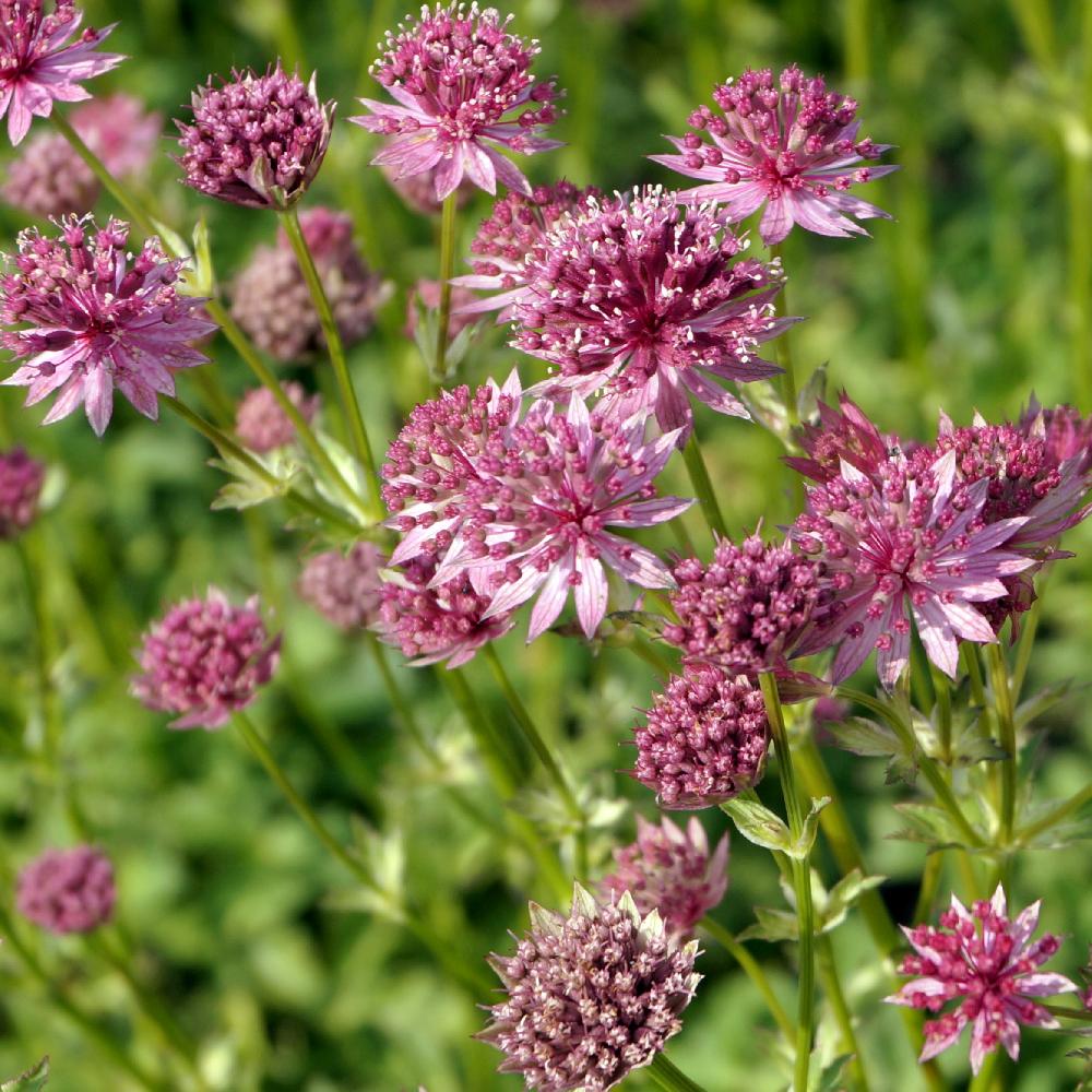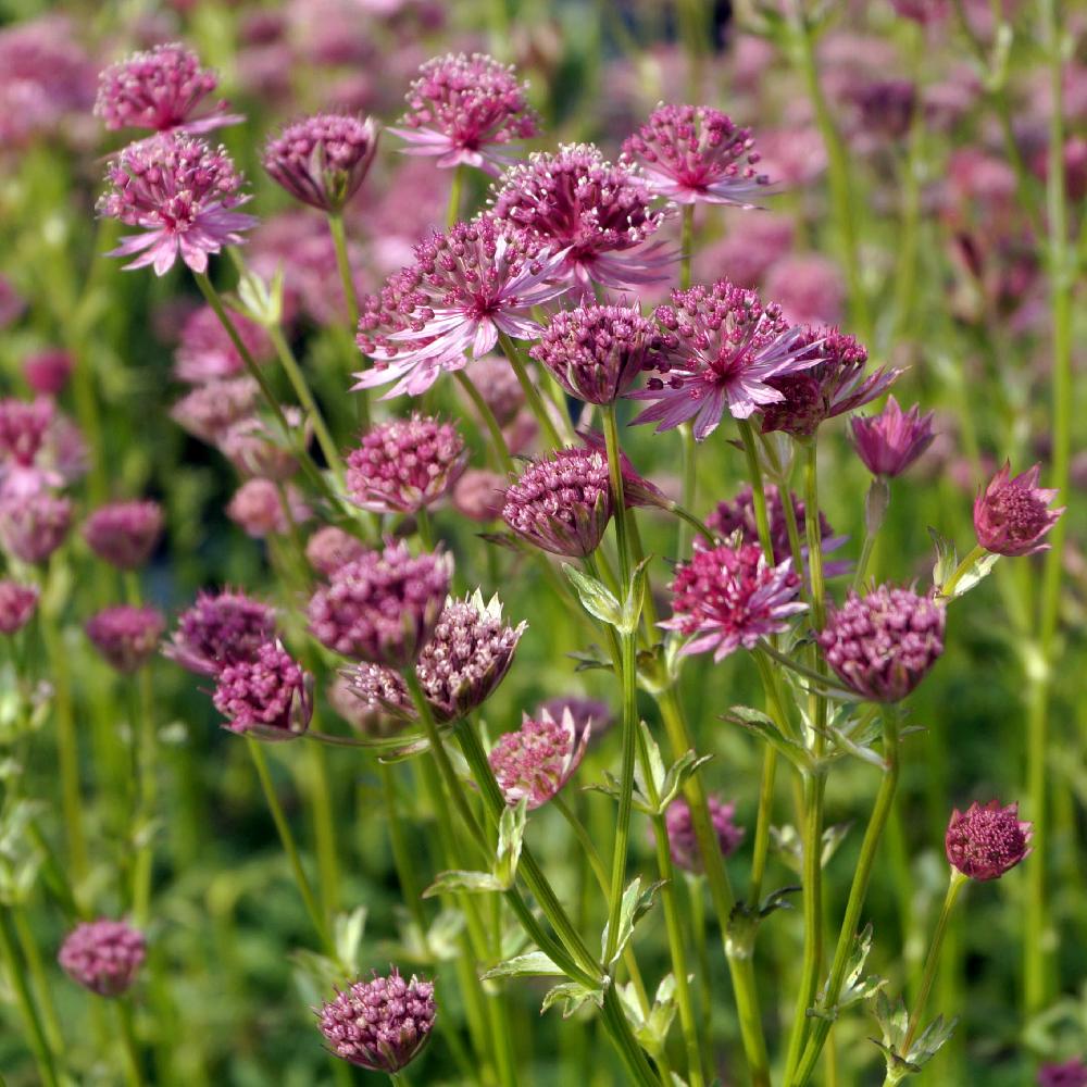 L'ASTRANTIA major 'Pink Pride' produit sans aucun doute l'une des plus belles floraisons du genre. Les ombelles cernées de bractées rose clair, veinées de rose plus foncé, sont composées de petites fleurs formant un pompon rose clair.
