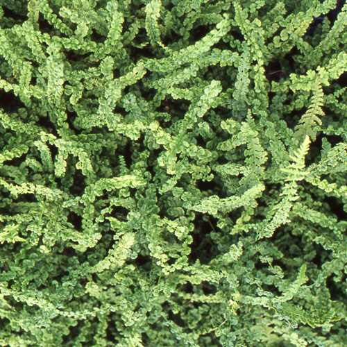 Petites frondes arrondies et recourbées sur de nombreux rameaux très fins, formant un colimaçon.
