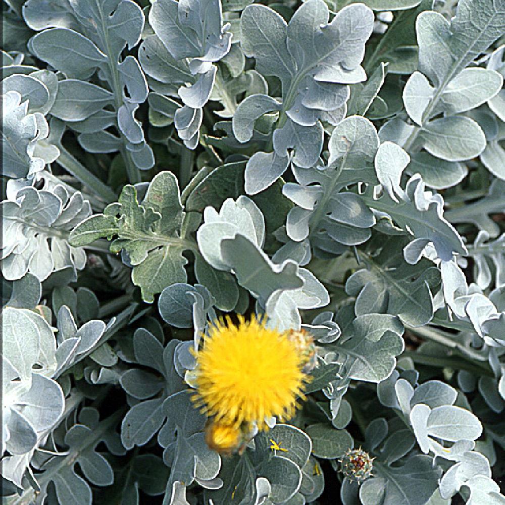 CENTAUREA ragusina est une vivace de terrain sec qui forme une belle touffe gris argenté, de feuilles très découpées. En été, elle produit des tiges blanches et épaisses qui portent des pompons jaunes très denses.