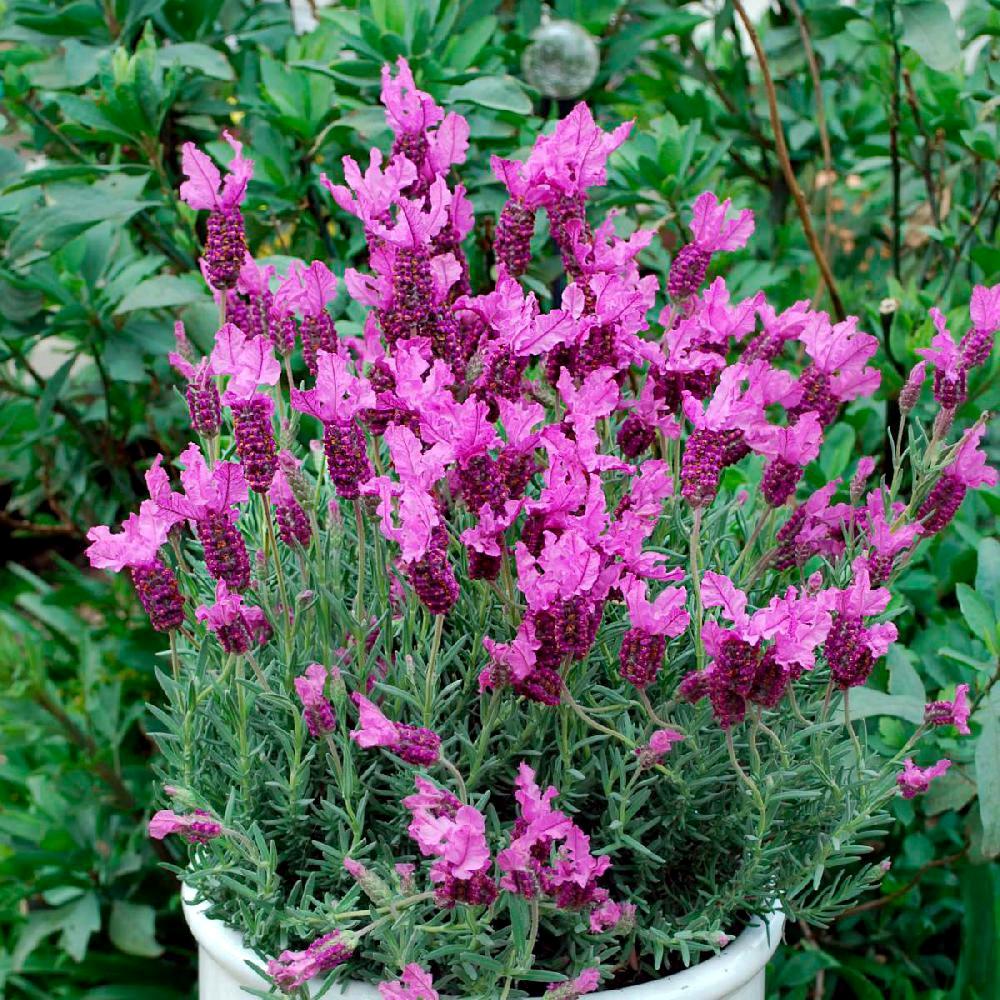 LAVANDULA stoechas 'The Princess' ® forme un petit arbuste compact, de feuillage gris-vert, persistant et aromatique. C’est une variété de lavande papillon, aux fleurs à la forme caractéristique, qui se distingue par un coloris plus intense. Elle produit, précocement, des fleurs en épis rose violet surmontées de bractées rose vif, bien visibles.