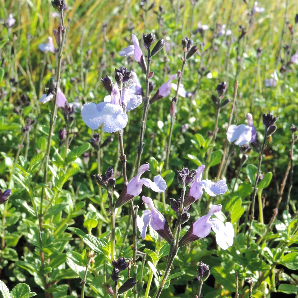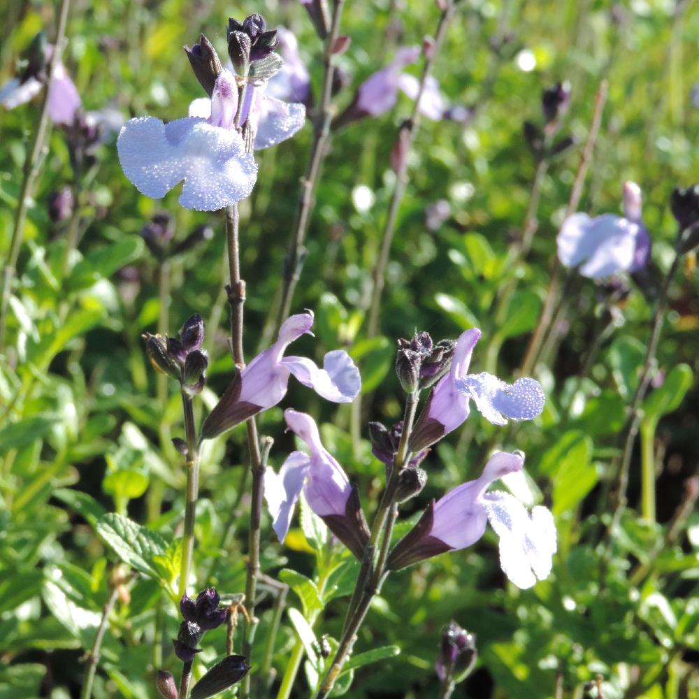 Issu de la série "So Cool", réputée pour sa floribondité et sa résistance, Salvia microphylla 'So Cool Pale Blue'® se distingue par une floraison généreuse et continue, ainsi qu’un port compact et buissonnant, bien ramifié dès la base. C’est une variété de petite sauge arbustive, rustique dans les régions clémentes, qui forme une touffe dense d’environ 60 à 80 cm de haut. Le feuillage finement denté d’un vert soutenu est aromatique au froissement, légèrement citronné. La floraison s'étend du printemps jusqu’aux premières gelées, avec peu de répit en saison. Les fleurs, typiques du groupe microphylla, sont petites, mais nombreuses et bien mises en valeurs par un contraste marqué entre des calices très sombres, presque pourpres, et une corolle bleu pâle, lavée de reflets gris perle ou bleu ciel selon la lumière. Ce jeu d’ombres et de nuances apporte beaucoup de subtilité à l’ensemble, et distingue nettement cette variété dans les massifs.