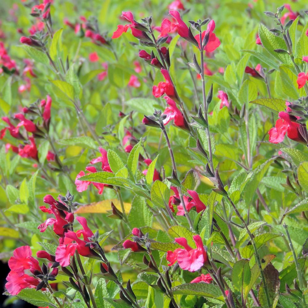 Buissonnante et ample, aux feuilles vert clair aromatiques, avec une floraison rouge éclatante rehaussée par des calices sombres.