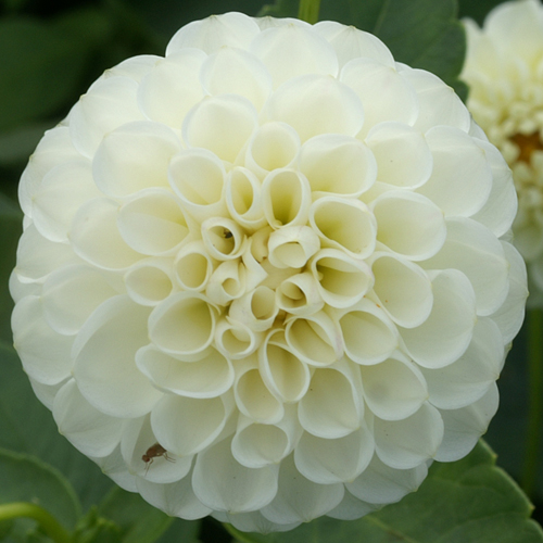 Dahlia pompon (fleurs doubles, sphériques, pétales incurvés). Fleurs blanche.